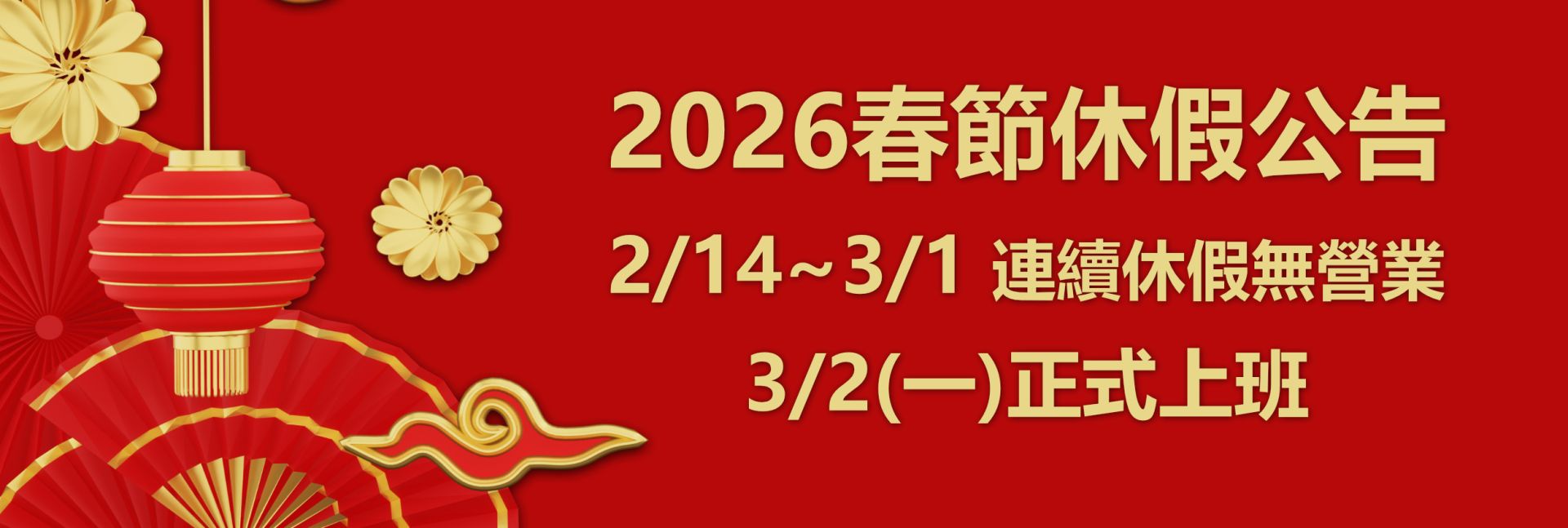 親愛的客戶您好,感謝您長期的支持與信任。本公司將於 2026/2/14(六)至 3/1(日) 期間休假,暫停營業。3/2(一)起恢復正常上班與服務。